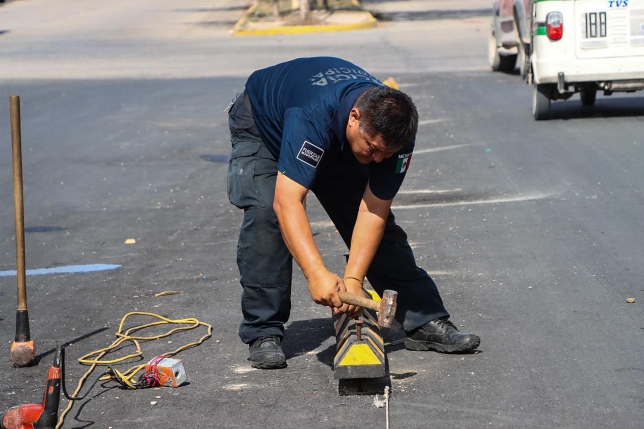A nombre del secretario de Seguridad Ciudadana Municipal, Raúl Tassinari González, el director de Tránsito y Vialidad, Arturo Pech Martínez, supervisó la colocación de boyas y bolardos para delimitar los dos arroyos vehiculares que confluyen en este crucero recién abierto por el Gobierno Municipal beneficiando a las familias solidarenses.